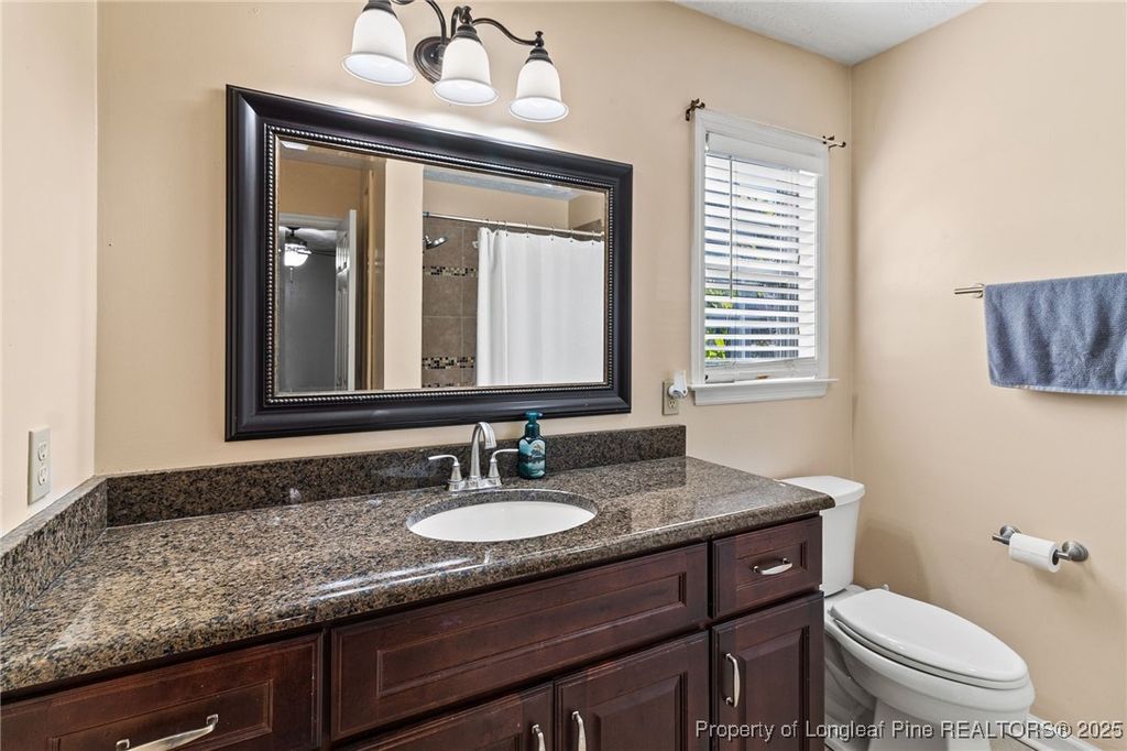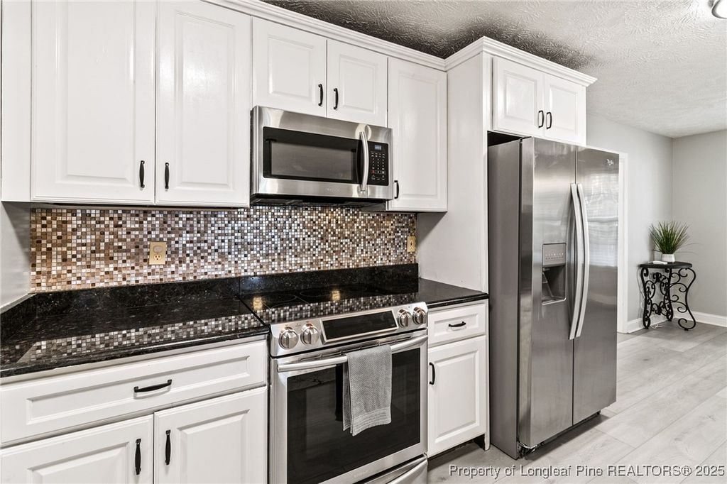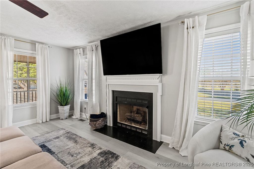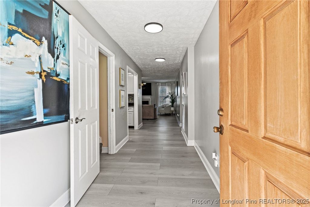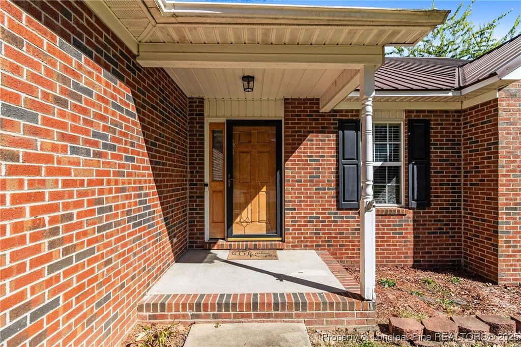 Welcome home to Wayside and close to Fort Bragg. This ranch with a bonus room home offers comfort and functionality with a well-designed layout and practical features throughout. The exterior includes a brick veneer with vinyl accents, a durable metal roof, gutters, and a fenced backyard ready for outdoor enjoyment. Inside, LVP flooring extends through the main living areas, with carpet in the bedrooms and bonus room for added comfort. The kitchen is equipped with an electric stove, over-the-range microwave, dual sink, refrigerator, pantry, and an eat-in area that connects to the living room featuring a gas fireplace. Two coat closets and two linen closets provide ample storage space in the hallway leading to the bedrooms. The primary bedroom includes an ensuite bath with a tub/shower combo, tile surround, granite countertop, tile flooring, and a walk-in closet. Additional features include a guest bath and secondary bedrooms, one with a vaulted ceiling. Outdoor highlights include a screened porch, deck with built-in bench seating, patio, firepit, and floodlights. The home also offers a two-car garage, attic access panel, ceiling fans, smoke alarms, and a laundry closet with hookups for everyday convenience.
