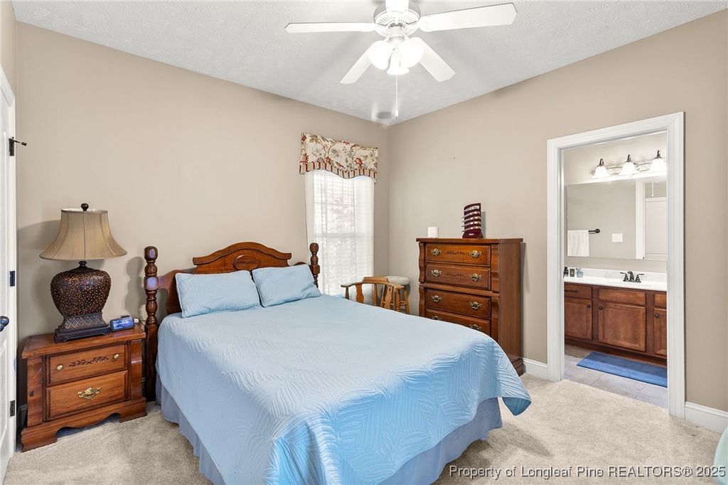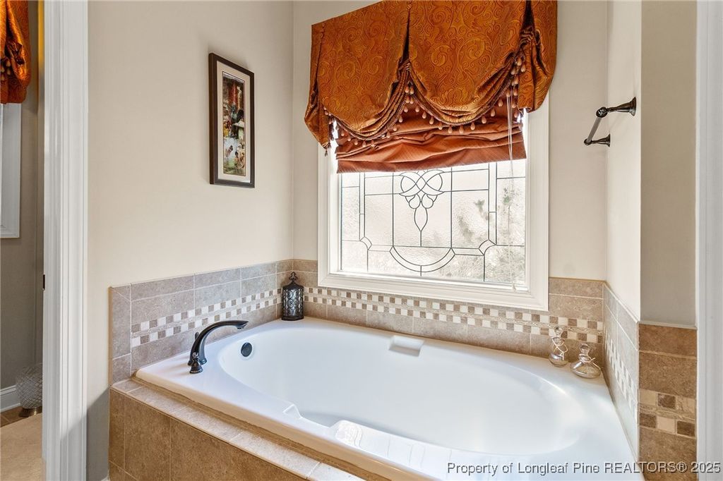 The primary suite is generously sized and features a large walk-in closet. The ensuite bath includes dual sinks, a garden tub, and a separate shower for added convenience. The second primary bedroom comes with its own private bath, providing an extra layer of privacy for guests. The third bedroom is equipped with built-in shelves and easy access to a third full bathroom.