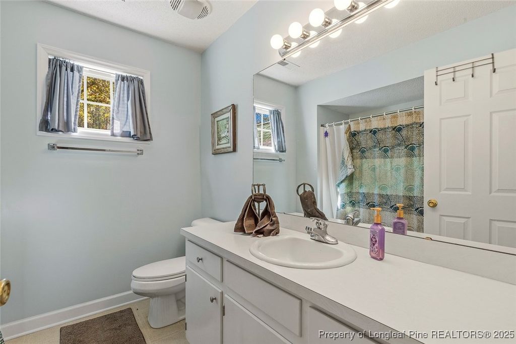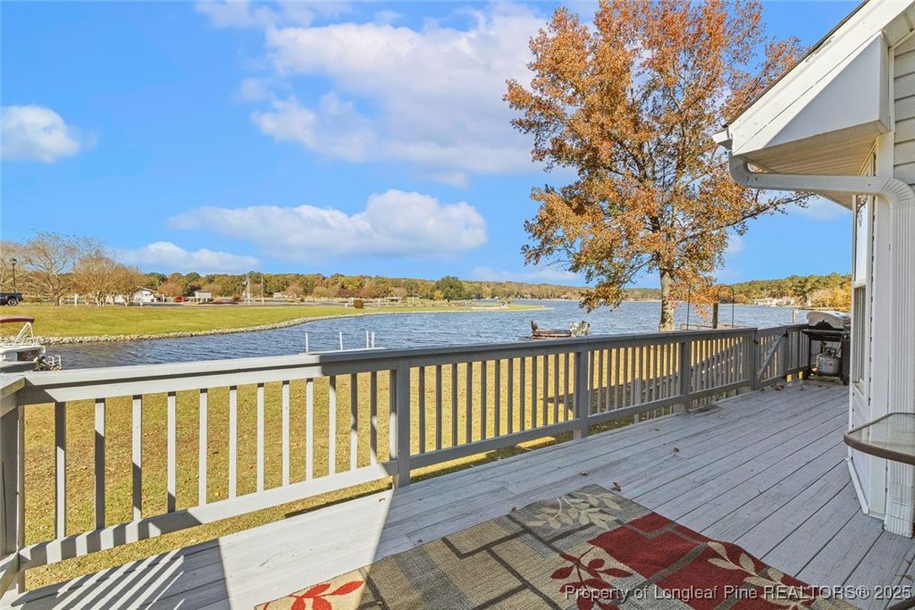 Waterfront home with stunning views located in the gated and golf community of Carolina Trace. BEWARE, this home is only for owners who want to live in a place that feels a vacation everyday with the views, fishing, pontooning, golf, and tons of other activities! Upon entrance to this bright and open home you will see views of Lake Trace immediately. Beautiful floors, tall ceilings and windows add to the beauty of this home. Cozy living room with wood burning fireplace. Spacious eat-in kitchen with tons quartz counter space, cabinets, and a neutral backsplash. The first floor primary suite is spacious with updated double sink vanity and walk in shower. The best part of the primary bedroom is the door leading to the deck to enjoy beautiful views. The second floor offers 3 additional bedrooms and a full bath. Outside this home has a dock for any electric motor boat. This community also has a pool. This property is a must see.