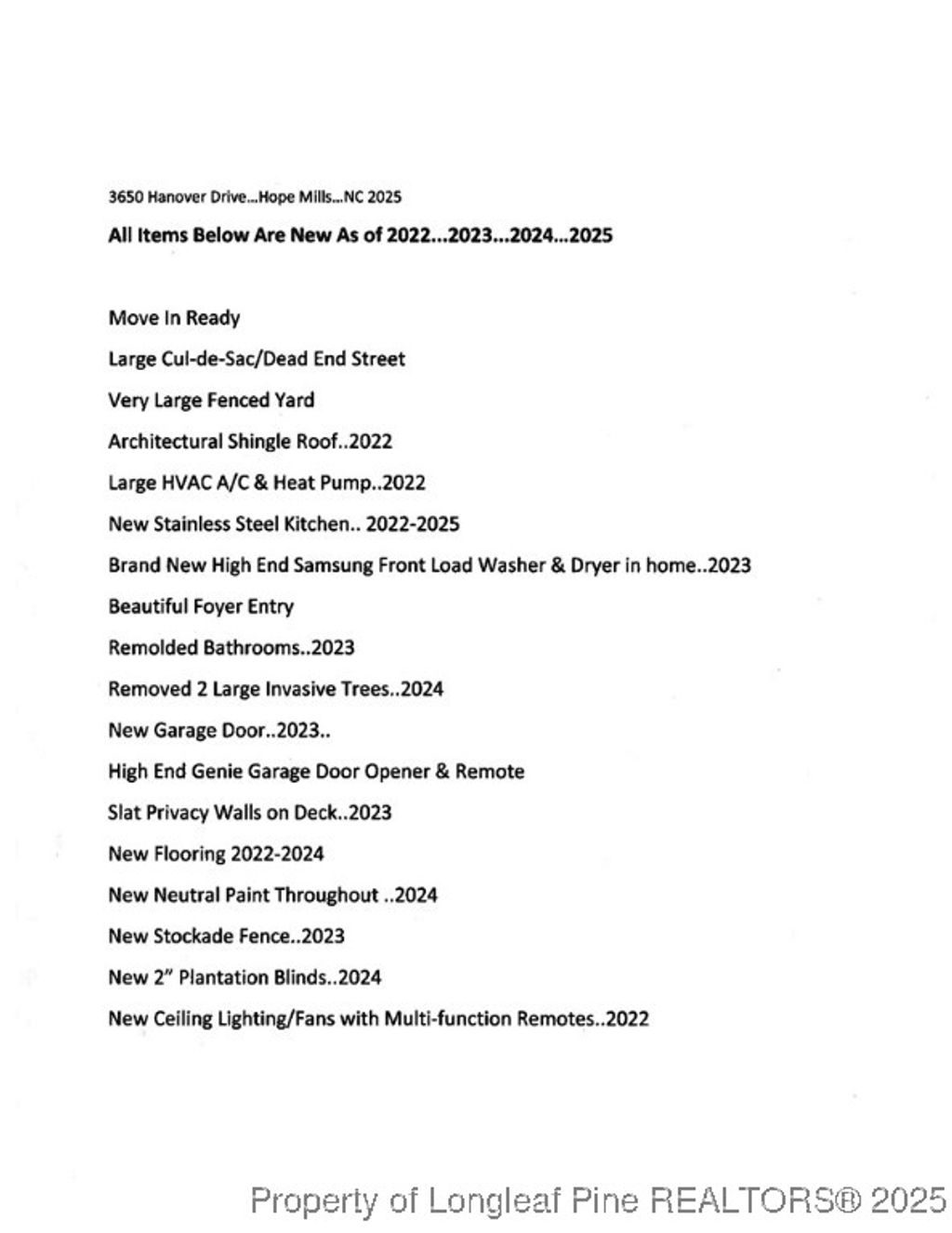 Move-in ready ranch in Hope Mills, set at the end of a quiet cul-de-sac and thoughtfully updated throughout. This 3-bed, 2-bath home offers a smart layout with an inviting entry foyer, a true formal dining room, and a comfortable living area centered around a classic wood-burning fireplace "” perfect for cozy evenings and a touch of timeless charm. The kitchen features painted cabinetry in a soft designer green, creating a warm, intentional feel. The neutral color palette and a long list of major improvements: architectural shingle roof (2022), new heat pump (2022), remodeled bathrooms (2023), fresh interior paint (2024), and new 2'' plantation blinds (2024). The kitchen features stainless steel appliances updated between 2022-2025, and the 2023 washer and dryer remain for the new owner's convenience. The Storage is a standout here, with multiple closets and well-planned space throughout the home The living area feels warm and inviting, centered around a wood-burning fireplace that brings a classic touch you don't find every day. Step outside to a private back deck overlooking the very large and fully fenced yard, ideal for relaxing, entertaining, or letting pets roam. A 1-car garage, with a new door installed in 2023 with an upscale genie door opener/ remote, which adds both storage and practicality. If you're seeking a well-maintained, move-in ready home with all the essential updates already handled, this property delivers.