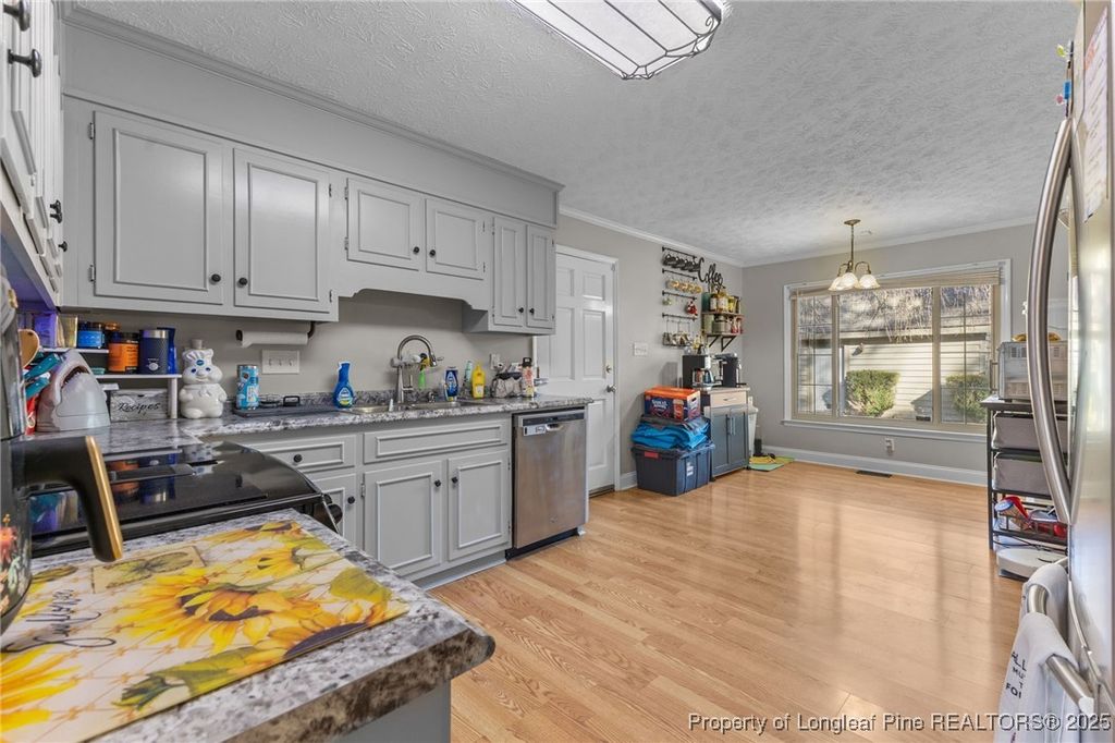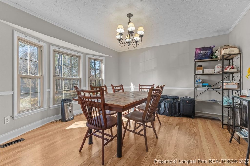 Very well situated home within minutes of shopping & dining. Three bedrooms and two full baths upstairs and one half bath downstairs. In the Spring the front yard on this house is lovely with the dogwood tree & azalea bushes. All bedrooms are upstairs. On the main level, the family room features a stylish gas fireplace and beautiful oak-look laminate plank flooring. Formal dining room with bow window letting in plenty of natural light. The kitchen cabinets have been updated with a beautiful color which complements the existing neutral color scheme. Again, lots of natural light floods in through the large window at the eat-in-area of the kitchen. The laundry space and half bath round out the downstairs level. Extra large primary bedroom with the master bathroom having had the shower updated. All new carpet. Ceiling fans in all bedrooms, the great room & the covered back porch. Very nice backyard with a large workshop with power, shelving, cabinet storage and semi-finished space above. Extra parking pad. This is a SOLID home.