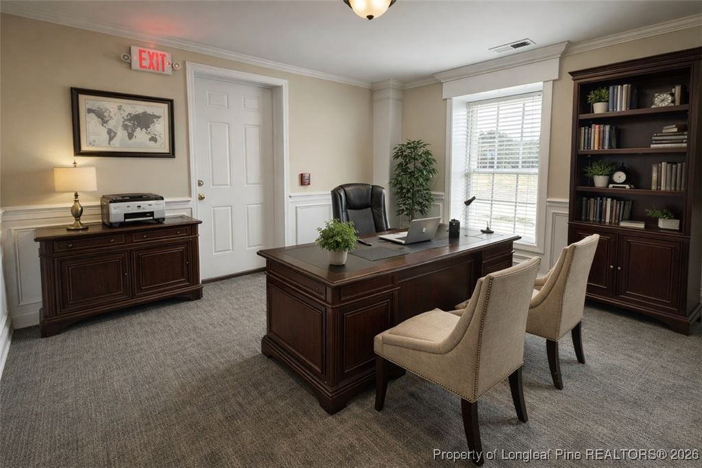 OFFICE SPACE AND GARAGE FOR RENT $1800 MONTHLY. Office and Garage space available. Great location near Walmart and Lowes. 1ST Floor Office Space 1460 with 2 handicap bathrooms. 2ND Floor has 400 SF with Office and Restroom. Garage Storage 620 SF. Above Garage space has 420 SF with Office and Restroom. Pole Sign and Security fence. See attached floorplan.