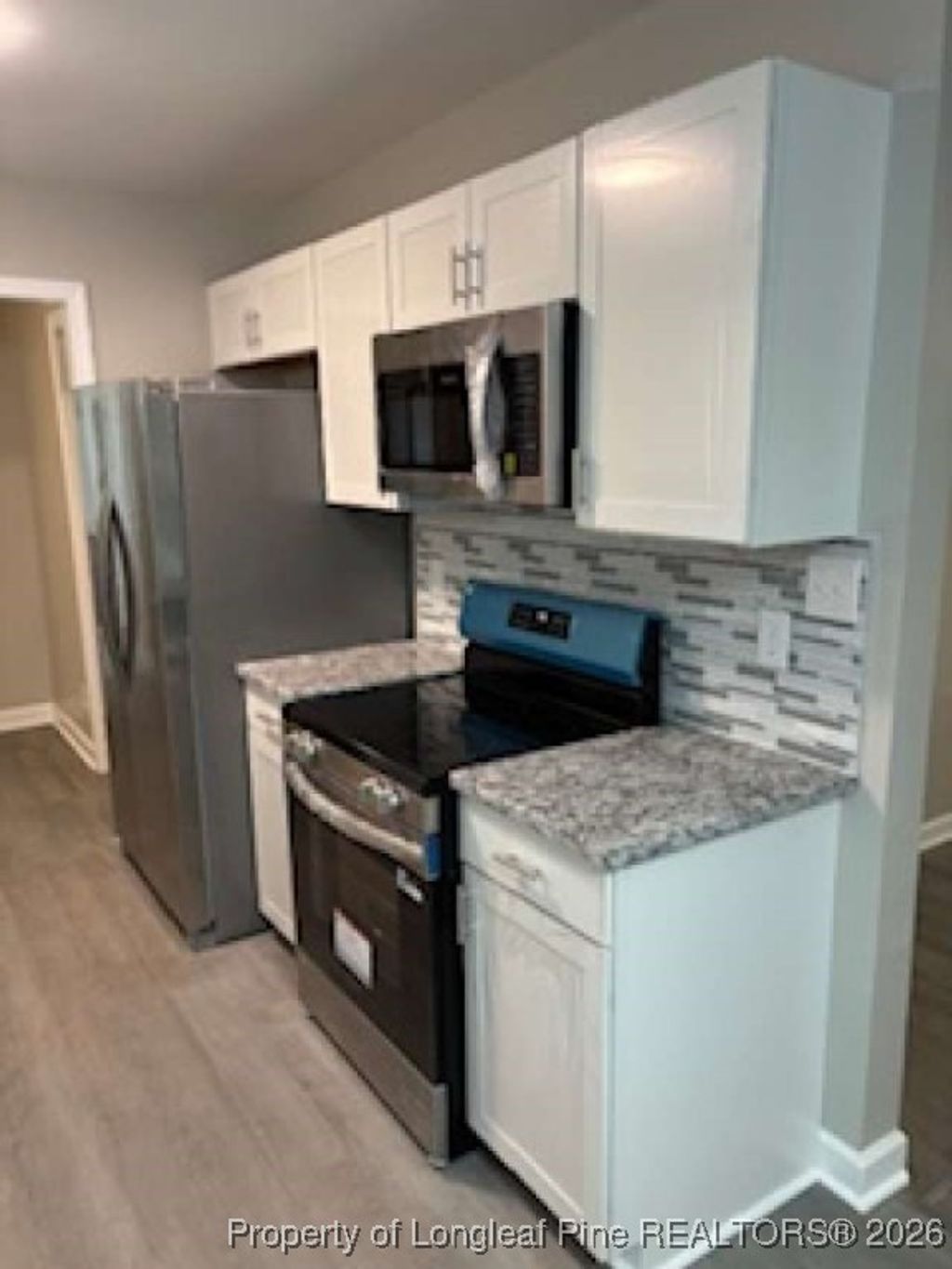 Beautifully remodeled 3-bedroom, 2-bath in a cul-de-sac move in ready home. Updated kitchen with new cabinets, backsplash, new granite countertops & new stainless steel appliances. New vanities on both bathrooms. New faucets and light fixtures across entire house. Primary suite with private bath and plenty closet space. Freshly painted, new doors and new LVP flooring throughout. New water heater, garage door, vinyl siding and vinyl windows. Covered front porch. Located just minutes from Fort Bragg, shopping, and dining,