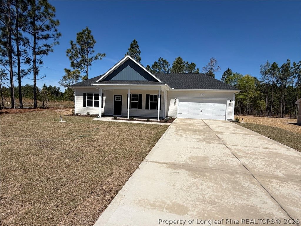 If a RANCH is what you need...look no further!! The Cumberland is a thoughtfully laid out ranch with spacious great room with electric fireplace, well-appointed kitchen with granite counters and beautiful cabinets and casual dining that is sized well enough for larger dining set. The primary suite features tray ceiling and ensuite with shower, dual vanity and walk in closet. 2 additional bedrooms share bathroom with adult height vanity; and You'll love that there are NO restrictive covenants or HOA's. Country living with easy access to Fort Bragg and shopping.