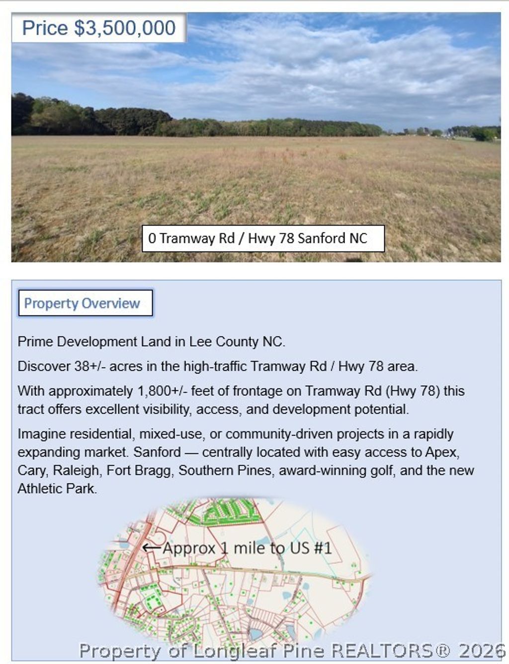 COME GROW WITH US "” Prime Development Land in Lee County NC. Discover 38± acres zoned RA/R1 in the high-traffic Tramway Rd / Hwy 78 area "” an exceptional opportunity in one of North Carolina's fastest-growing counties. With approximately 1,800± feet of frontage on Tramway Rd (Hwy 78) and roughly 520± feet of frontage on Brantley Rd, this tract offers excellent visibility, access, and development potential. Imagine residential, mixed-use, or community-driven projects in a rapidly expanding market. Lee County ranks #11 among North Carolina's fastest-growing counties (World Population Review). Don't miss this chance to grow with us! Approx. 1 mile to US#1. Sanford "” centrally located with easy access to Apex, Cary, Raleigh, Fort Bragg, Southern Pines, award-winning golf, and the new Athletic Park. PIN Number: 9641-14-2832-00.