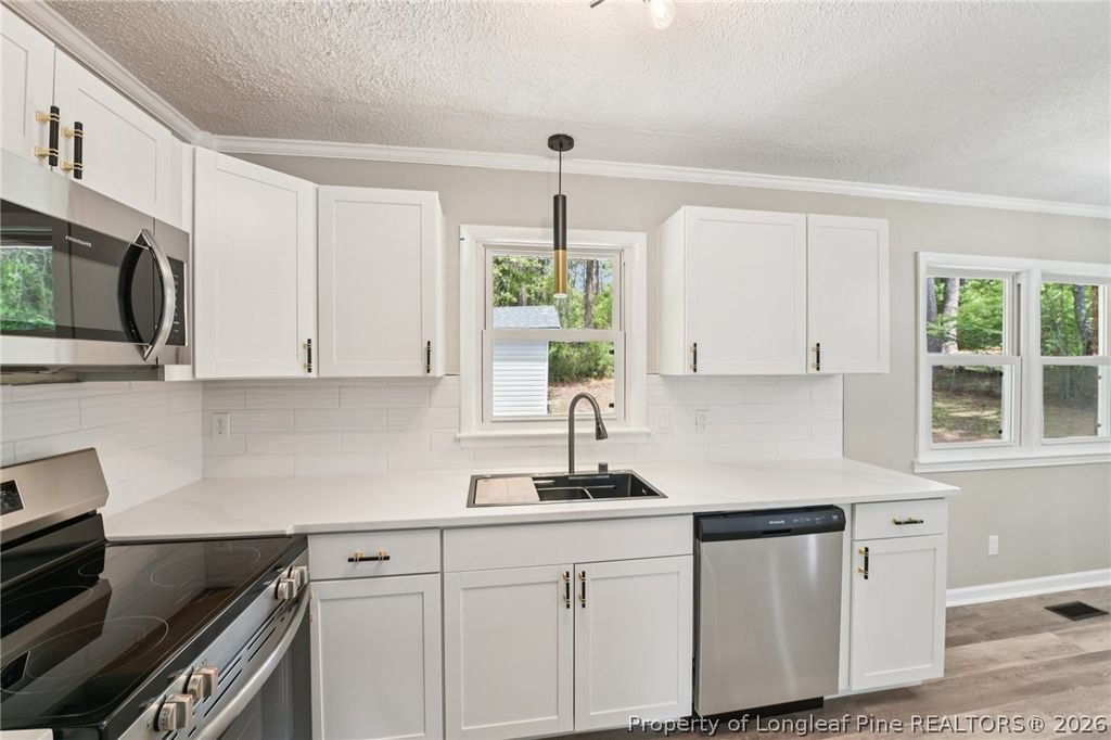 Welcome to a fully updated home offering modern comfort and style. Step inside to discover brand new lvp flooring and lush carpeting throughout. The home boasts a brand NEW ROOF with architectural shingles , NEW HVAC -Good man unit, and fresh interior paint, ensuring peace of mind. The kitchen shines with all-NEW cabinets, quartz countertops, backsplash, and NEW stainless steel appliances. Both bathrooms are fully updated with new vanities, LED mirrors, tubs, showers, and fixtures. A custom-themed sauna adds a special touch of luxury. With new light fixtures, recessed lighting, and fantastic curb appeal, this home is ready for you to move in and enjoy!