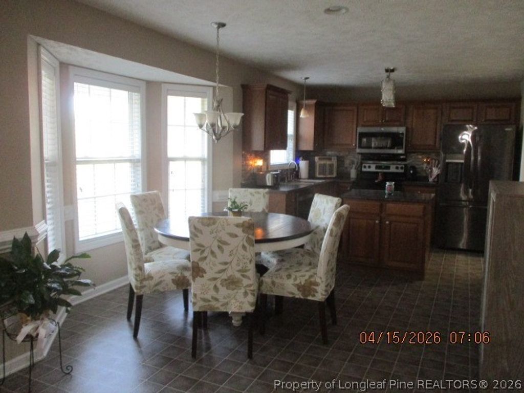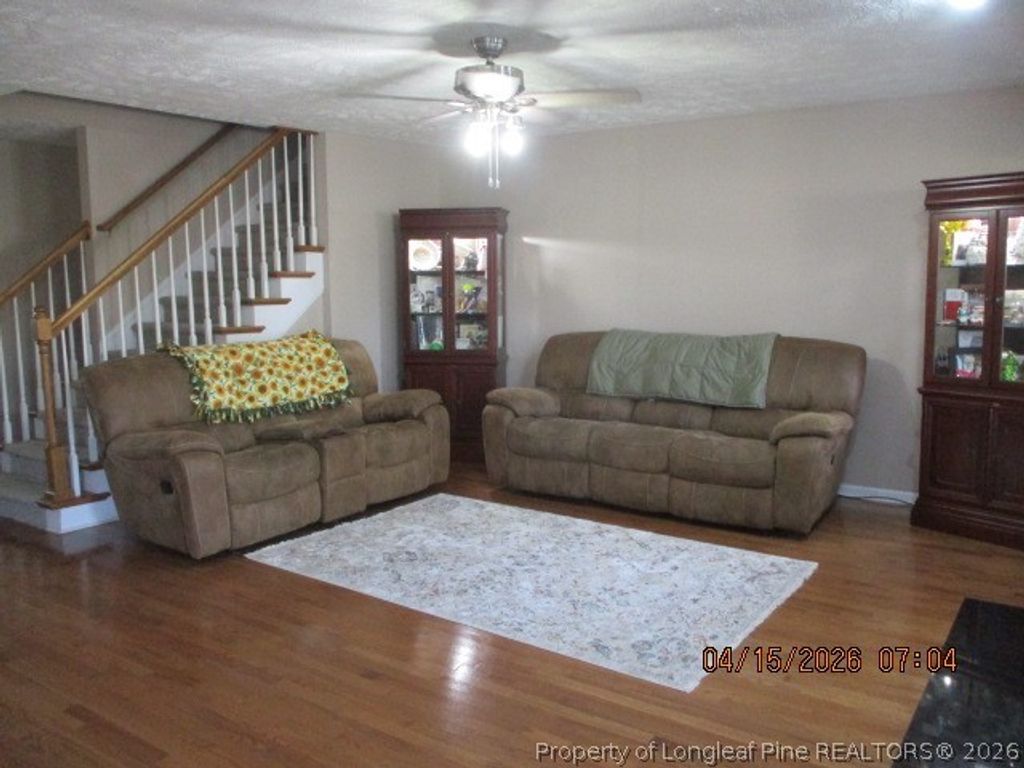 Beautiful home on almost 3 acre lot. Walk-in foyer with hardwood floors into living room open to dining area and kitchen with stainless appliances to include refrigerator, dishwasher, disposal, range and microwave. Off kitchen is separate laundry that leads into double garage. Downstairs features Primary bedroom with walk-in closet, bath with double vanity and large walk-in shower. Also, downstairs are two additional bedrooms and full bath. downstiars has new carpet in bedrooms. Upstairs has bedroom with walk-in closet, office or craft room, large bonus room with full bath tub/shower combonation. Exterior is also amazing front porch with ceiling fan, back covered deck with ceiling fan, detached garage, extra storage and single carport attached. Heat window a/c, 30 amp hookup Pool table is negotiable. Country living lots of space with easy commute to Fayetteville, Ft. Bragg, I-95 You will not want to miss is wonderfully loved property.