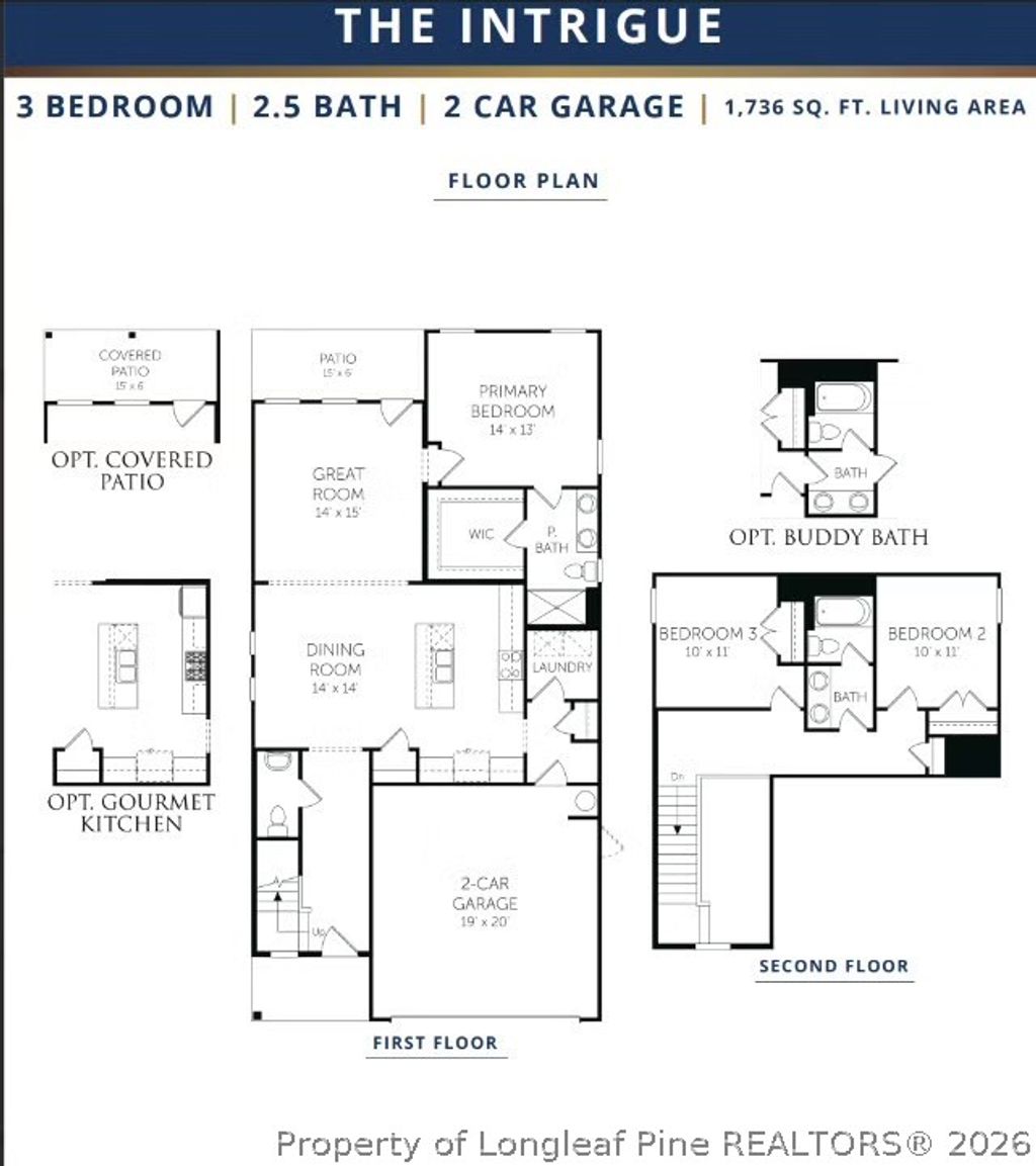 Conveniently located in the charming community of Pikeville, NC, this beautifully designed Intrigue offers the perfect blend of small-town charm and modern living. Residents enjoy quick access to local favorites like Nahunta Store & Grill, with Goldsboro less than 20 minutes away for shopping, dining, and retail at Berkeley Mall and Eastgate Shopping Center, making daily errands and outings simple and convenient. The Intrigue is a stunning two-story home thoughtfully designed for both style and functionality. Featuring three spacious bedrooms, this layout offers a first-floor primary suite complete with a generous walk-in closet and a spa-like walk-in shower, creating a private and relaxing retreat. The main level is ideal for everyday living and entertaining, with an open-concept island kitchen featuring quartz countertops that flows seamlessly into the dining area--perfect for hosting gatherings. A bright great room opens to a patio, and a two-story foyer floods the home with natural light, creating an open and welcoming atmosphere. Laminate flooring throughout the main living areas adds durability and modern appeal. A separate laundry room and convenient half bath complete the main level. Upstairs, two additional bedrooms share a well-appointed full bathroom featuring a double vanity, offering comfort and convenience for family members or guests. Additional highlights include a two-car garage and modern design elements throughout. Situated approximately 15 minutes from Seymour Johnson Air Force Base, the Intrigue offers an easy commute for active-duty military, reservists, and civilian personnel while preserving the relaxed pace of small-town living. With its thoughtful layout, upscale finishes, and prime Pikesville location, the Intrigue delivers comfort, functionality, and modern style in a move-in-ready home.