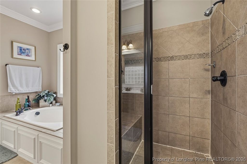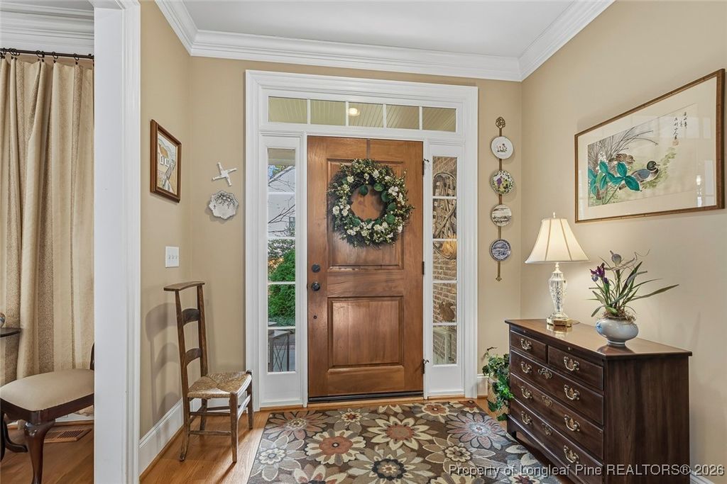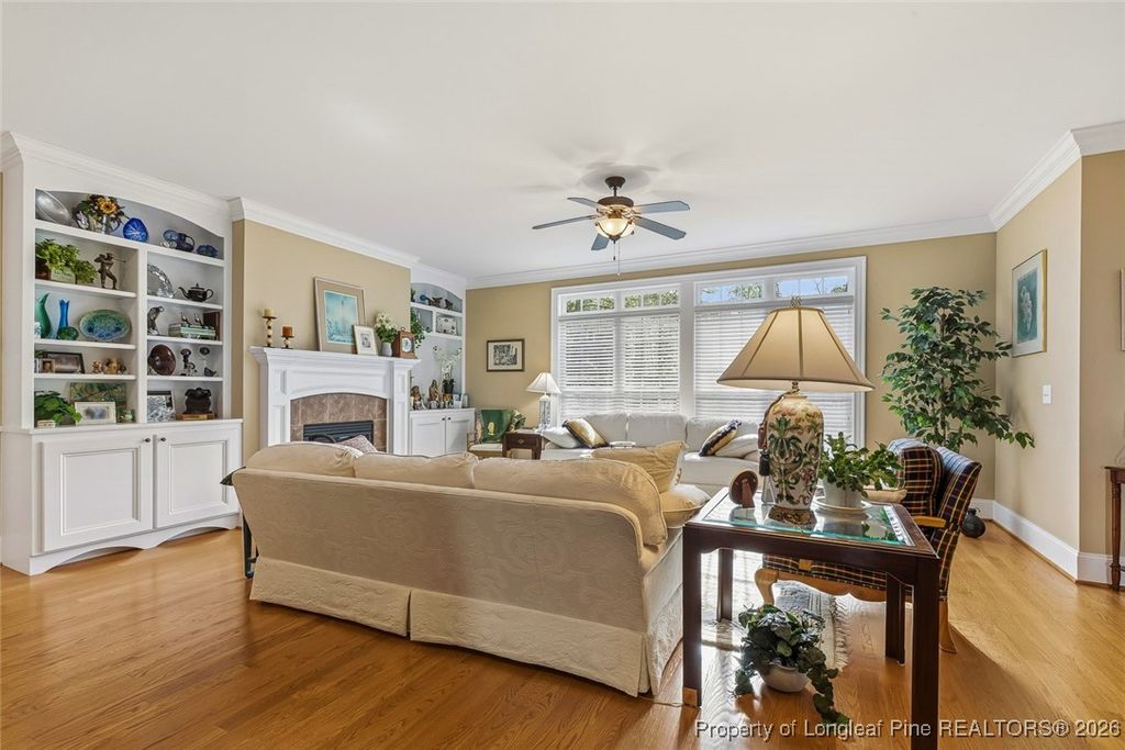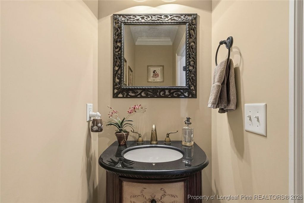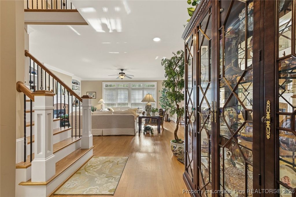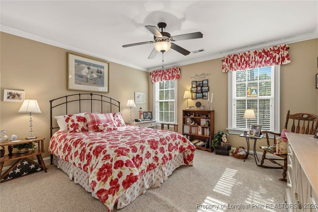 Lovely custom home located in the gated and golf community of Carolina Trace. This home borders the 12th hole of the Creek Golf Course, one of two, 18 hole, Robert Trent Jones golf courses. Scenic and peaceful views located at the end of court/cul-de-sac. The beautiful detail of this home include wainscoting, crown molding throughout the first floor, real hardwood floors, natural light, and beautiful views. Large formal dining room with easy connection to kitchen. Plenty of granite counters and cabinets, double ovens, island, and large pantry. The eat-in kitchen opens up to a perfect sunroom/Carolina room. Sunroom opens up to a new 240 square foot elevated Trex deck facing the golf course perfect for taking in all the natural beauty Carolina Trace has to offer. Spacious living room with fireplace and built-in's. Large primary suite is located on the first floor. Walk-in closet, double vanity, walk-in shower, and garden tub make a wonderful retreat. Second floor has 2 additional bedrooms, a full bathroom and huge bonus room. Large 2 car garage and separate golf-cart garage. Not only does this lot offer picturesque views but as a bonus there is NO grass to mow only lovely bushes and trees to enjoy. This POA offers a community pool, and tennis/pickleball courts.